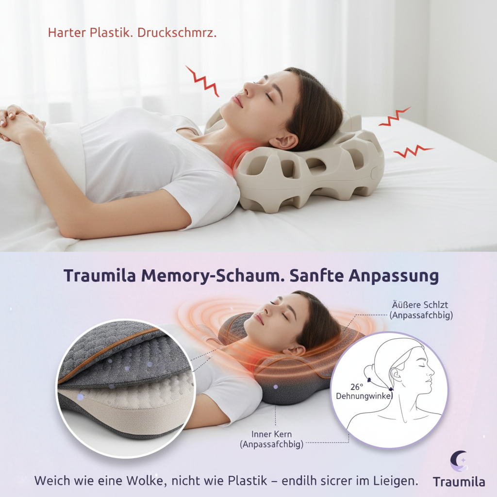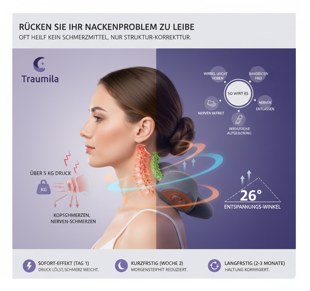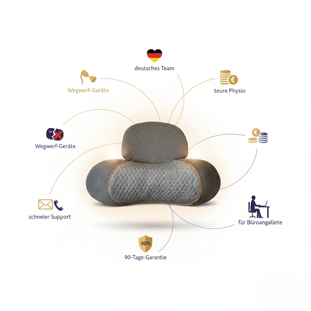 und stattdessen zum Therapiekissen gewechselt sind, das die Nackenmuskulatur in 30–90 Tagen neu kalibriert.